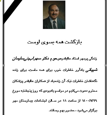 ضمن عرض تسلیت به خانواده محترم و بازماندگان، به اطلاع میرساند مراسم یادبود مرحوم دکتر سهراب بنی سلیمان روز پنجشنبه 1400/7/29 در سالن اجتماعات بیمارستان مهر برگزار میشود.